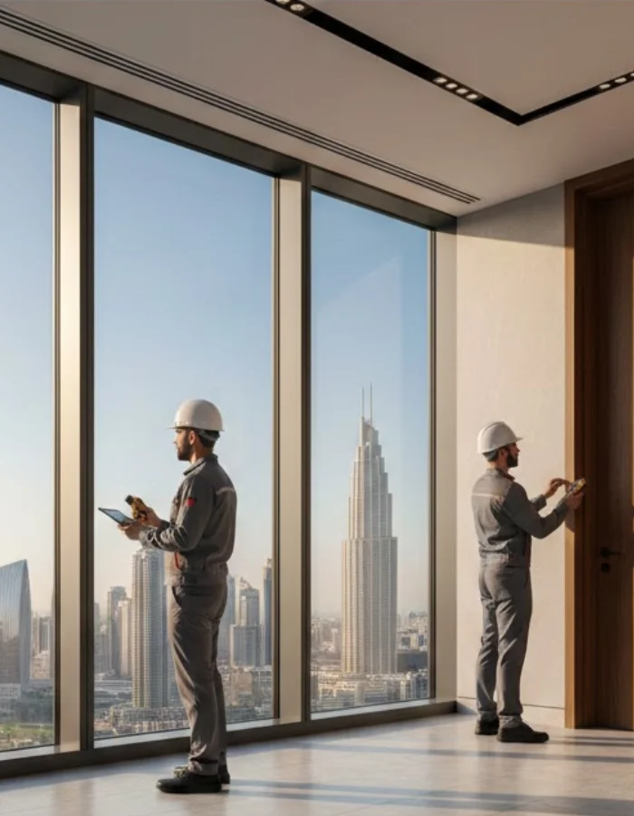 Windows are inspected by checking frames, hinges, locks, and glass panels for cracks, warping, or corrosion. Air and water leakage, alignment, and compliance with UAE building standards are also assessed.